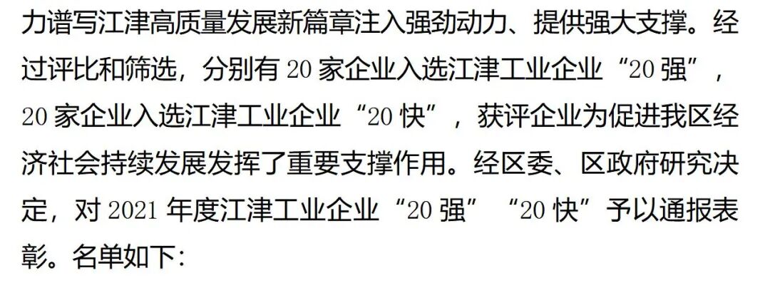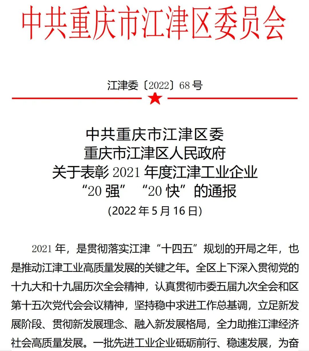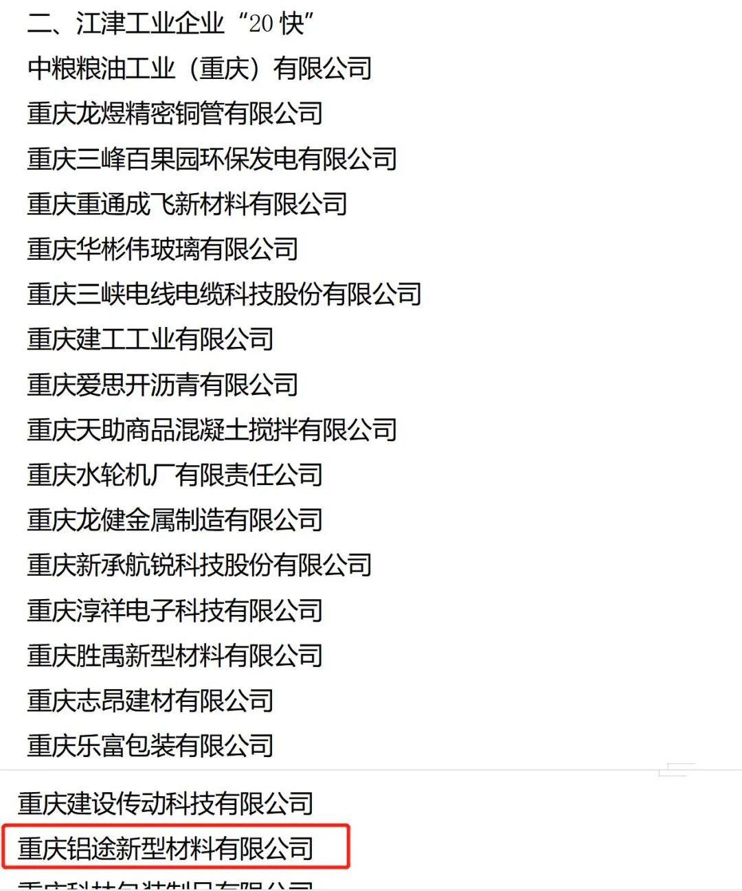 2022年5月16日重庆铝途新型材料有限公司荣获2021年度江津工业企业“20快”荣誉称号!